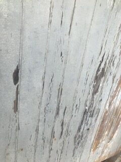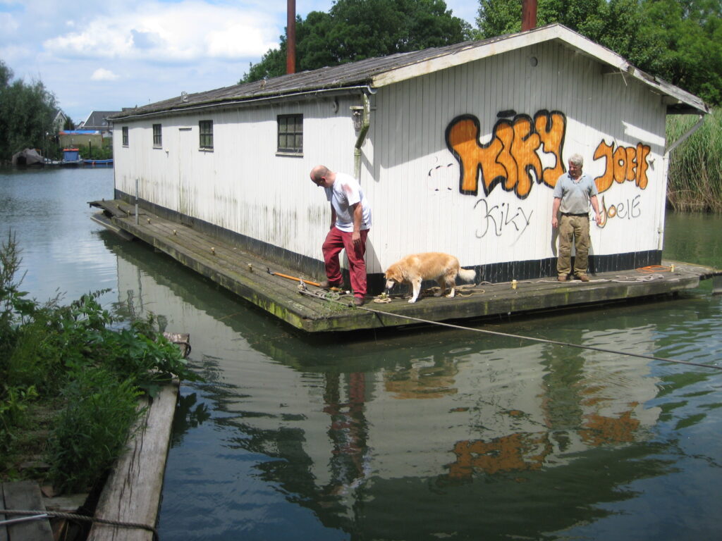 12, 14 en 16 november.Het hout is geleverd. Was de 12de met Eelco Nieuwenhuis in Krimpen Hij heeft van de onderkant van het dakoverstek de losse verf gestoken en met St Marc schoongemaakt. Dat kan dus geschilderd worden. Daarna zijn we naar de Bouwmaat in R’dam geweest om 5 platen gegrondverfd iroko hechthout in drie stroken van 40 cm te laten zagen. In de dagen daarna zijn van de meeste de randen in de epoxy gezet en al een paar platen met Grachtengroen satijnverf geverfd. De regels voor op de vloer aan de onderkant in de teer gezet. Ook is 2/3 van de zijwand ontdaan van losse verf, (zie foto). Dat doe ik met de haakse slijper met schuurschijf korrel 40. Daarbij is de schijf een keer klem geraakt tussen een lat, waardoor de haakse slijper uit mijn handen werd gezwiept en in het water terechtkwam.De aardlekschakelaar lag er uit, maar kon meteen weer worden aangezet.De haakse slijper kon ik aan het snoer weer boven water tillen. Thuis uit elkaar gehaald en gedroogd en de volgende dag werkte hij weer. De wand is al voor 2/3 eenmaal in de beits gezet. Zal nog een keer moeten, na licht opschuren.