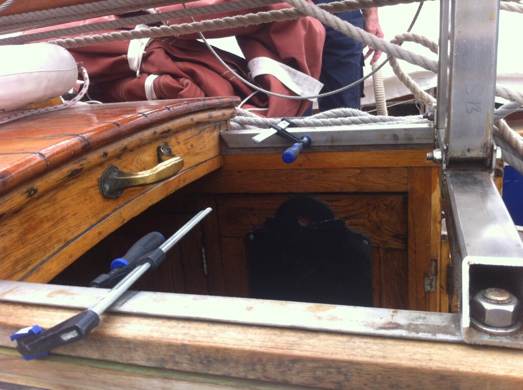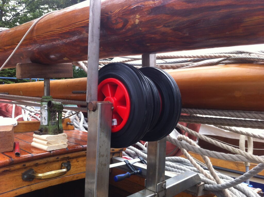 1: Krik de mast weer omhoog met behulp van de krik op het ingangsluik en op een plankje, zodat hij niet meer op de mik ligt.