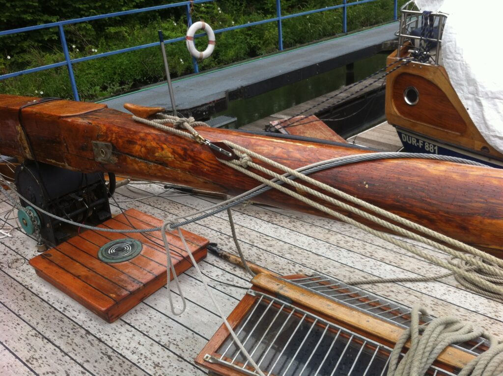 6: Nu kun je de mast van het steunbalkje op de ankerlier (even sterk zijn!) op de rol laten zakken. Zo nodig met een takel naar achteren trekken. Door een meerpen door het gat in de mast te steken kun je hem met 2 man tillen.