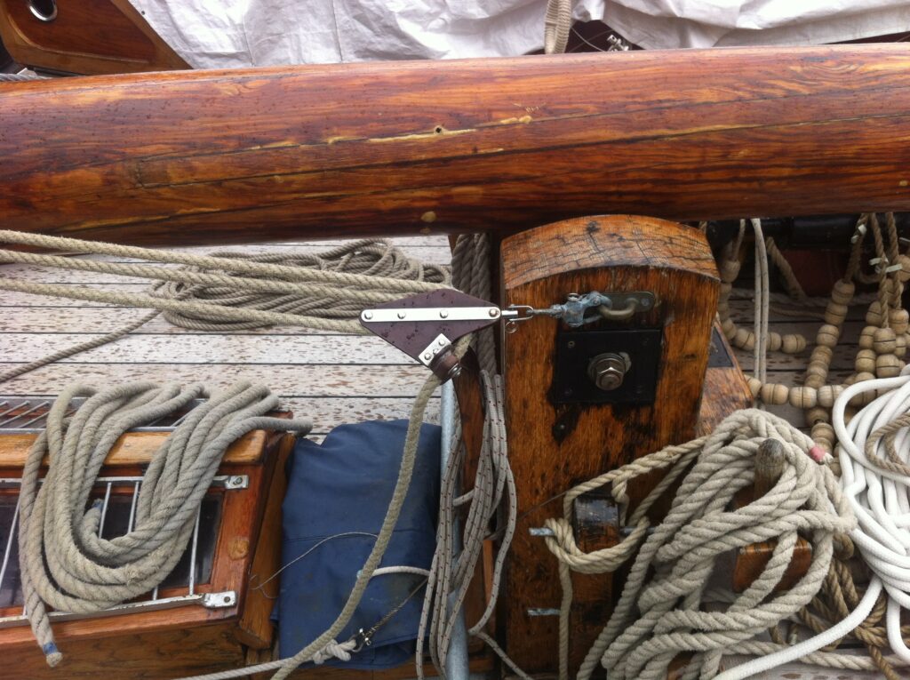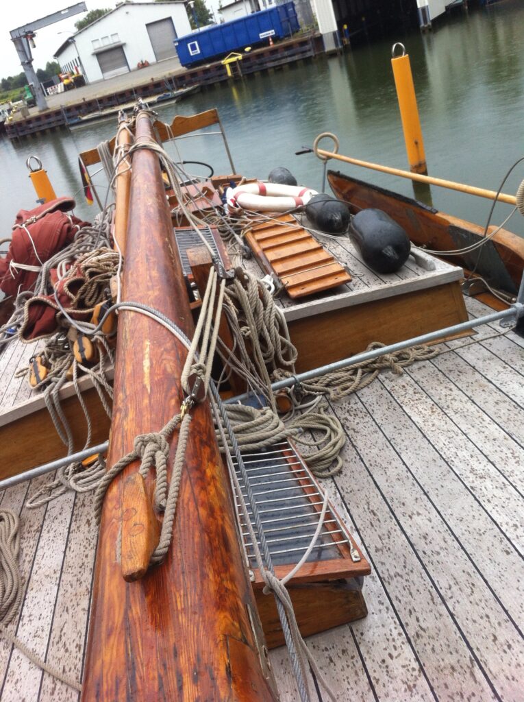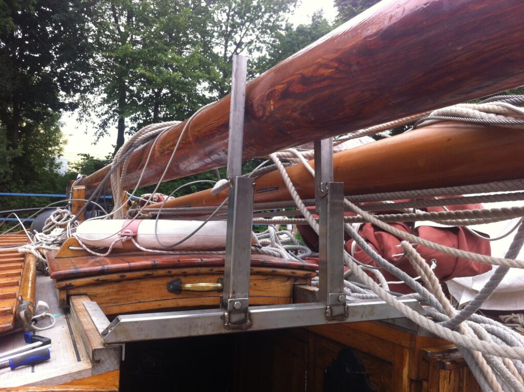 8: Leg de mast op het steunbalkje en maak hem met een touw naar BB en SB vast, zodat hij er niet afvalt. Door een meerpen door het gat in de mast te steken kun je hem met 2 man tillen.