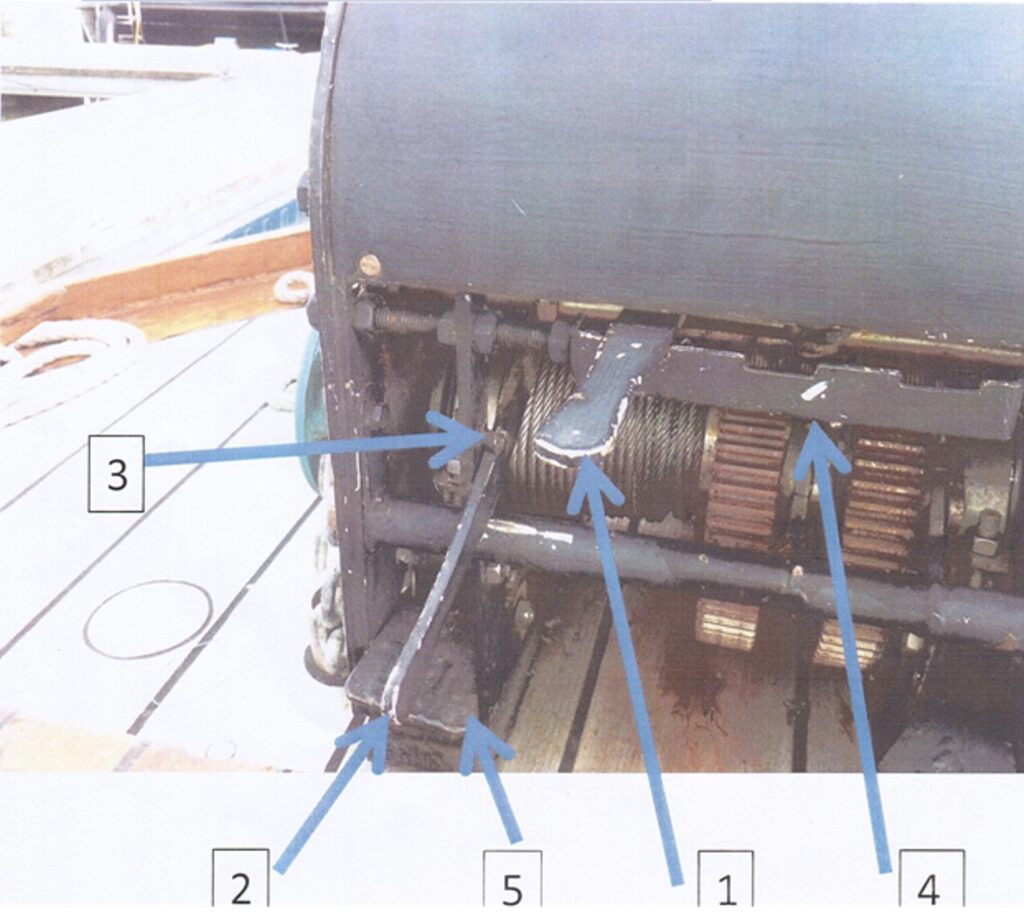 - Draai de handlier tegen de klok in waardoor er voldoende ruimte in de kabel komt om de mast met de dirk uit de klemming van de mastwangen te trekken. Dat kan zwaar gaan en onmogelijk zijn als de mastbout er nog in zit, of de zwanehals nog vaststaat of er iets aan de bokkepoot hangt!)